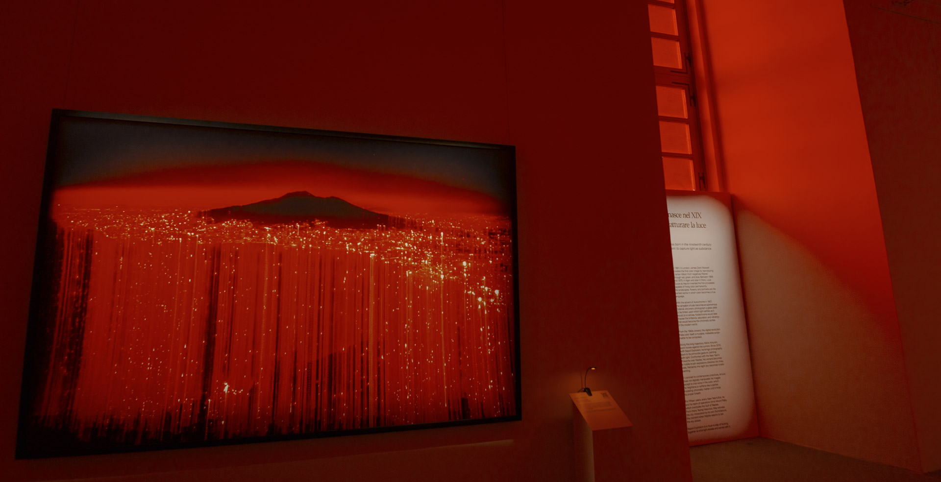 DA QUINDICI ANNI Amura, insieme a un gruppo di amici, documenta il Capodanno napoletano dalla cima del Monte Faito, registrando l’incredibile spettacolo luminoso attraverso il semplice uso dei tempi di esposizione e del movimento della camera: ne sono scaturiti nel corso degli anni migliaia di scatti che, riproposti a grandi dimensioni, affascinano l’osservatore, interdetto di fronte a composizioni fotografiche che sembrano dipinti. Come spiega il curatore, Sylvain Bellenger (ex direttore del Museo di Capodimonte), «queste immagini superano la dimensione descrittiva per assumere forme autono-me, astratte e pittoriche. Ne emerge una riflessione sul rapporto tra luce, tempo e percezione che rimette al centro la fotografia come linguaggio conoscitivo, capace di unire intuizione artistica e analisi scientifica». Le opere – circa una trentina – esposte in un’ala dell’immenso palazzo in via di ristrutturazione (tra i più grandi d’Europa), in pochi casi sono montate su light box, per la maggior parte sono stampate ad alta risoluzione e illuminate in modo impeccabile: del resto, diplomato al Csc, Amura è stato in passato anche direttore della fotografia per autori come Sorrentino e Guadagnino. Il risultato è che la texture di ogni lavoro si impone al pubblico con una densità materica e cromatica senza precedenti. A volte, si riconosce la sagoma del Vesuvio che si erge sul golfo di Napoli e sembra prendere fuoco allo scoccare della mezzanotte; altre, invece, sulla superficie si inscrivono scie luminose, ghirigori, arabeschi, campiture di colore, ecc. dalla cui visione scaturisce – dopo la prima sensazione di stupore – una riflessione sul rapporto tra il realismo e l’astrazione.