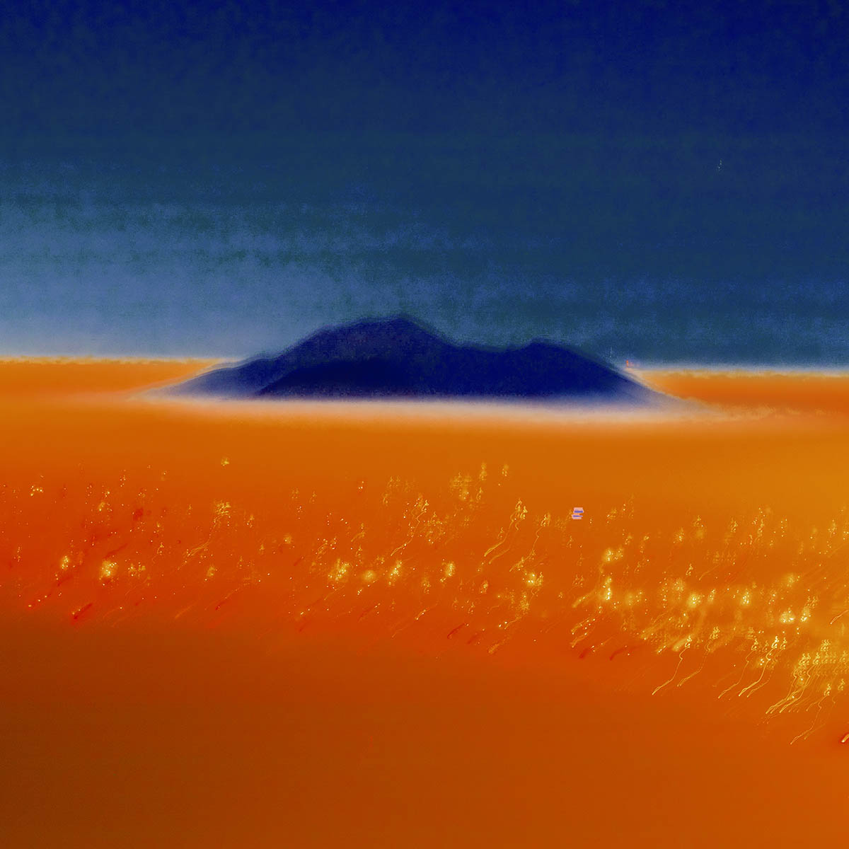 Fire, caramel, honey, or perhaps a lake of liquid flames: Vesuvius rises from a kind of golden tide whose nature cannot be discerned. It is the intense mist of that night of December 31, 2025, that gives the light this liquid, almost creamy quality, as though the color itself had melted into a flowing substance. The light has liquefied to the point where it no longer shows sparks or flickers, those usually produced by distance and by its passage through the atmosphere. From this luminous expanse emerges a small point, like the tip of a breast. And then there is that blue of Vesuvius, an impossible blue, belonging neither to mountain nor to sky, born from the night itself, pushed to its extreme by the photographer, like a painter forcing reality in order to draw out a secret color of his own imagination. There is something profoundly erotic and at the same time mysterious in this vision of Vesuvius which, on New Year’s Eve, appears wrapped not in its own fire but in a lake of light that caresses and envelops it. It is a marvellous and ironically inverted image: as if Naples, for one night, were defying the volcano by tenderly submerging it in light, instead of letting itself be buried beneath its ashes..